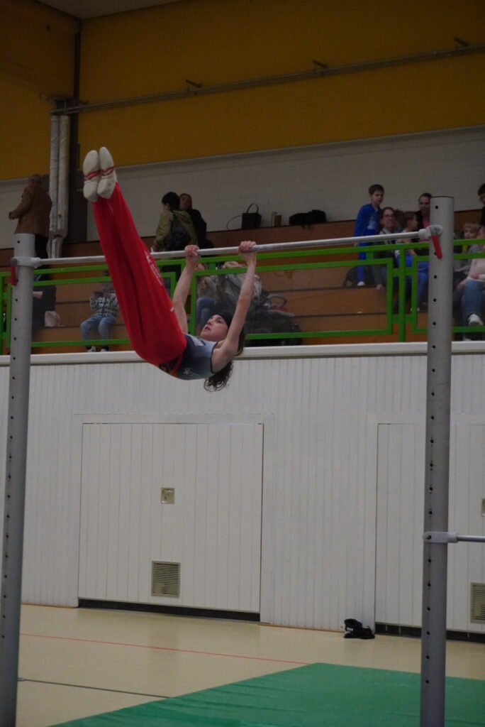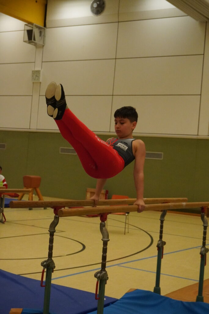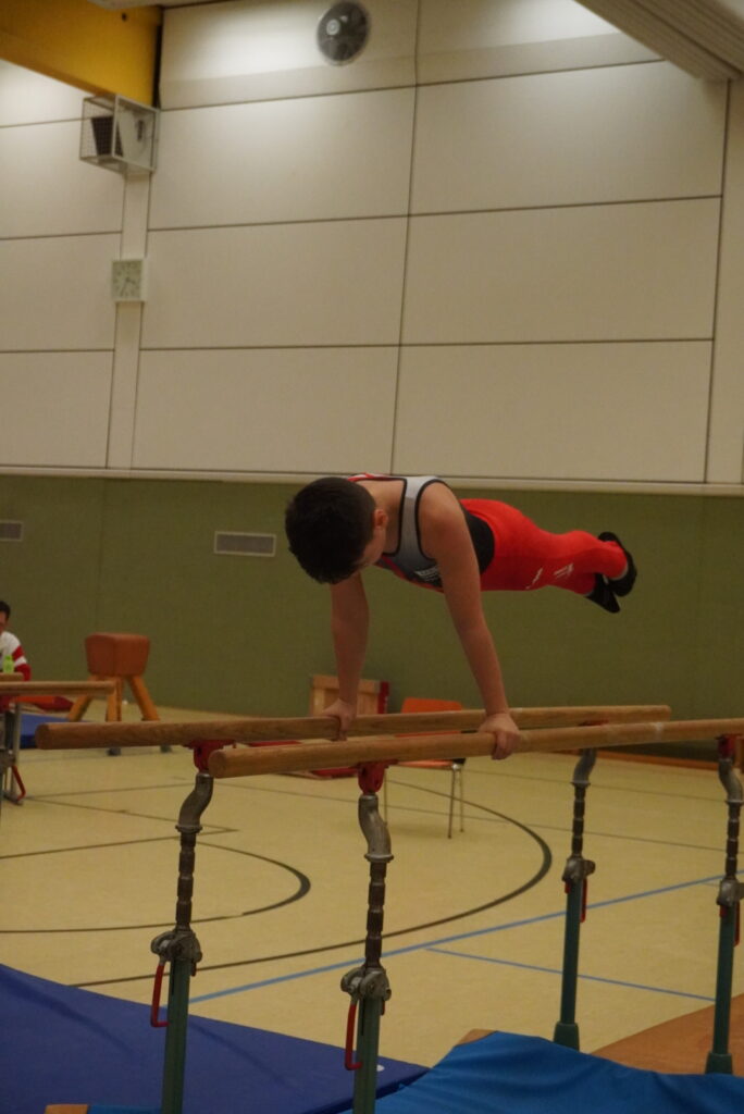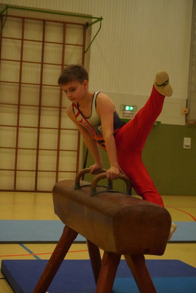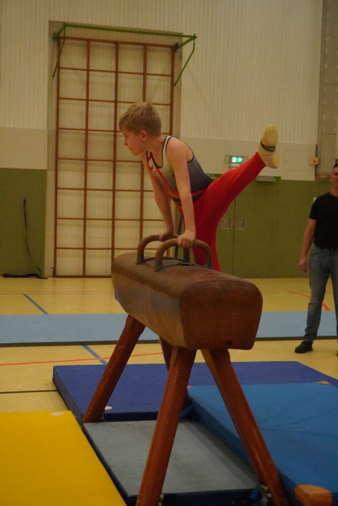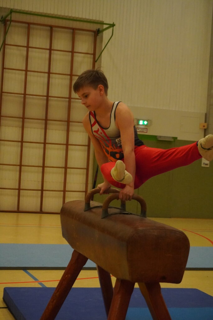 Die Jungs wussten, ein Patzer konnte den Wunsch vom Landesfinale zunichte machen, so wurde entschlossen weitergekämpft. Als nächstes ging es zum Reck, wo Niki wieder mal eine technisch perfekte Langhangkippe zeigte. Ebenso wurden Alexander und Denys für sehr gute Übungen mit jeweils 12,7 Punkten von max.15,0 Punkten belohnt. Doch dies beherrschte auch die Konkurrenz und somit ging das Zittern weiter. Am Pauschenpferd wurden ein paar Punkte gut gemacht durch hohe 13er Wertungen von möglichen 15,0 Punkten. Das letzte Gerät Barren lief dann eher durchschnittlich, denn zwischenzeitlich war der Wettkampftag schon lang geworden und die Konzentration der Jungs lies allmählich nach.